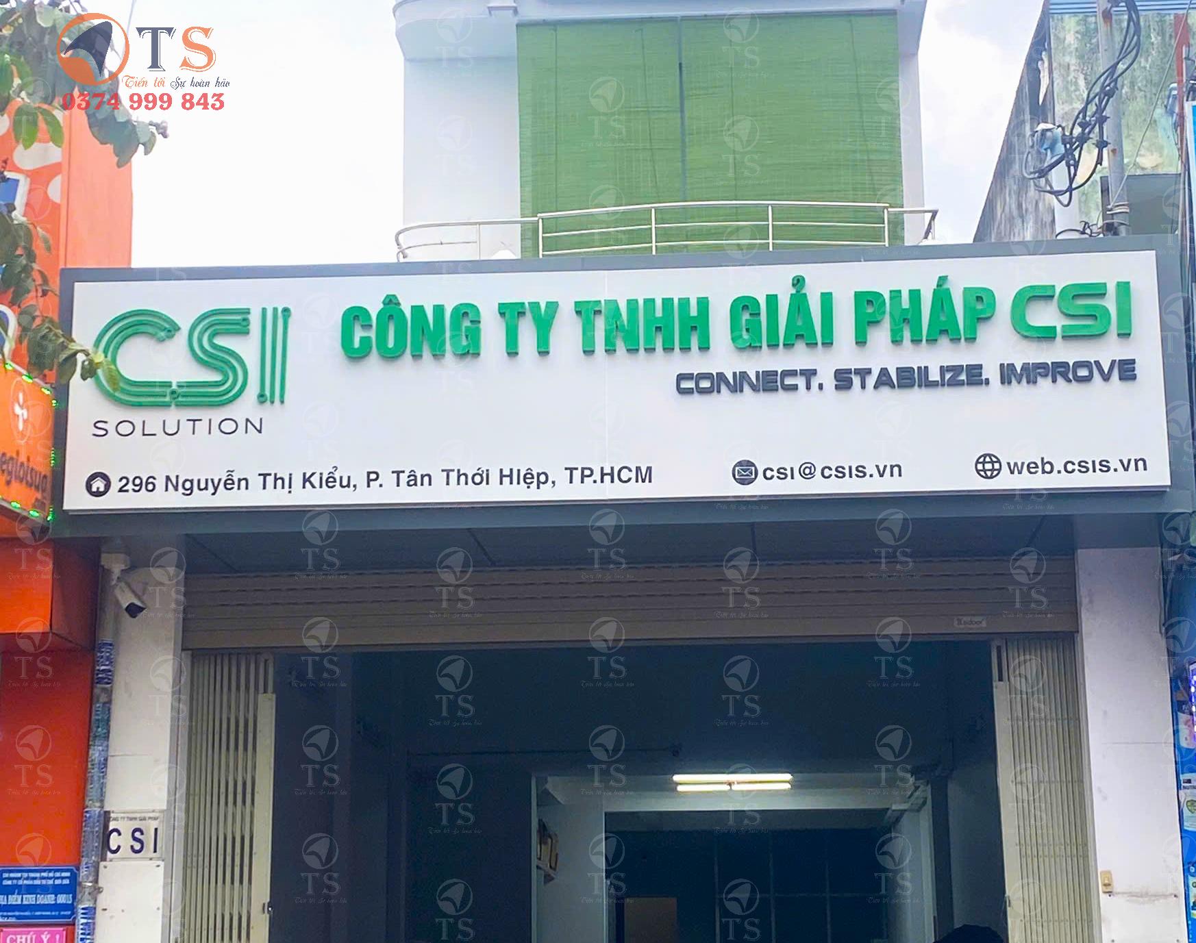 TS Quảng Cáo vừa hoàn thiện bảng hiệu công ty TNHH Giải Pháp CSI tại 296 Nguyễn Thị Kiểu, P. Tân Thới Hiệp, TP.HCM, với phong cách thiết kế tối giản nhưng sang trọng, giúp nhận diện thương hiệu mạnh mẽ và chuyên nghiệp.