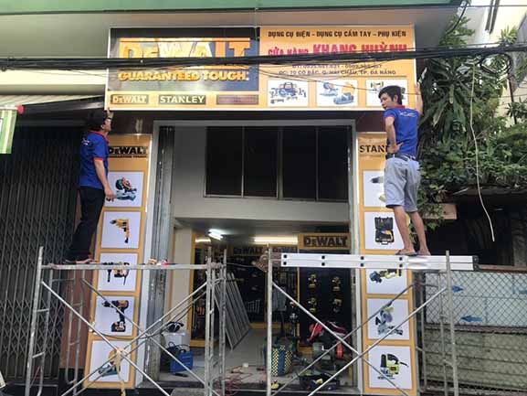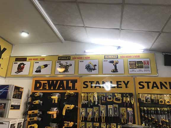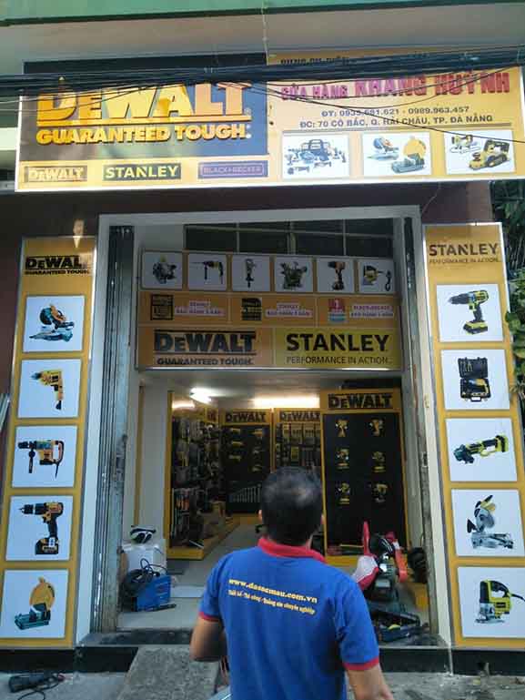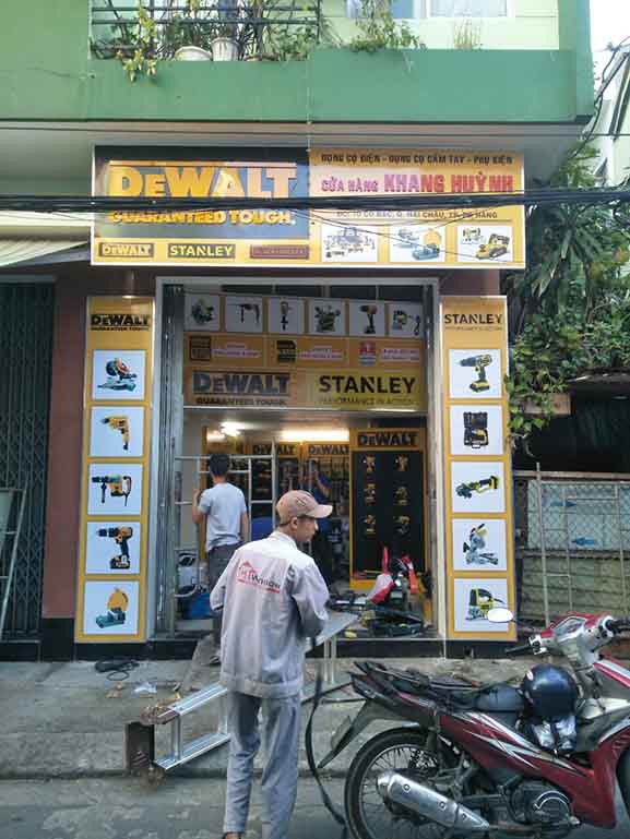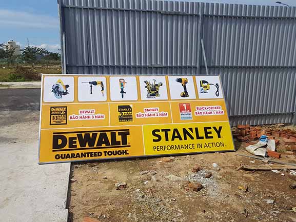 Thi công, làm bảng hiệu quảng cáo tại Tp Hồ Chí Minh và các tỉnh lân cận cho hãng Dewlt – Stanley là công việc thường xuyên với đơn vị chúng tôi, do các hãng này mới thâm nhập thị trường Việt Nam, nên vấn đề quảng bá thương hiệu được họ xem trọng rất cao, các hãng này lựa chọn kỹ các đối tác sản xuất bảng hiệu quảng cáo cho họ để lắp trên các đại lý ở Tp Hồ Chí Minh và Miền nam, đặc thù của hãng này có màu thương hiệu vàng rất bắt mắt người nhìn, và tài trợ khắp các cửa hàng bày bán sản phẩm nên tạo sự đồng đều, hút mắt người khác, gây ấn tượng cực mạnh.