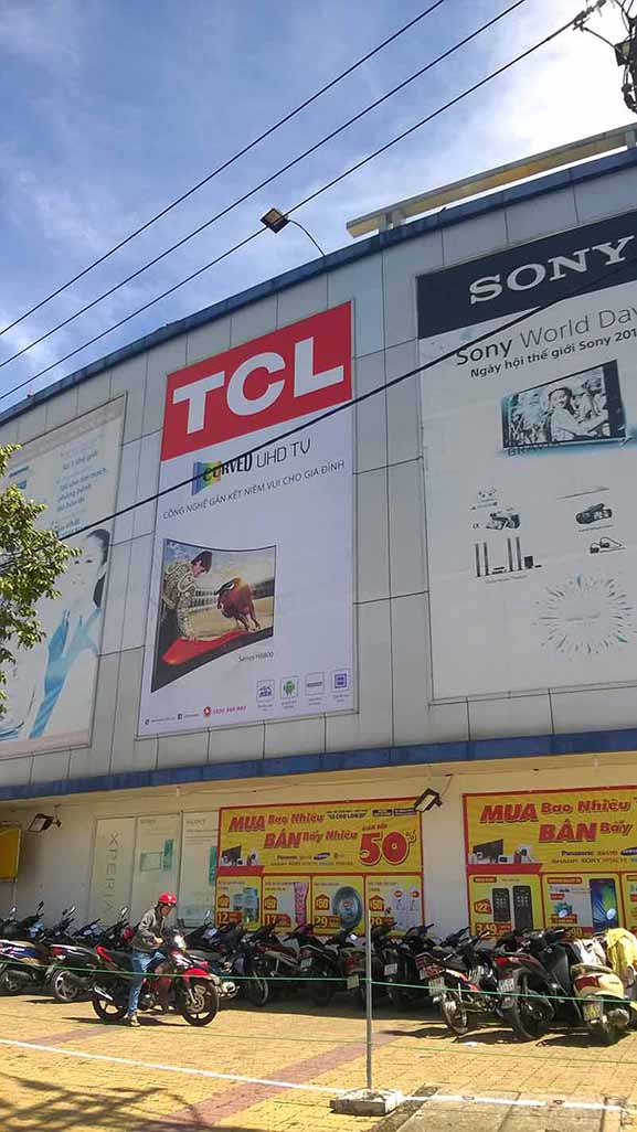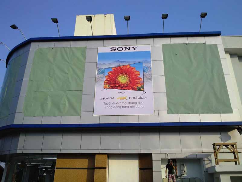 Bảng hiệu quảng cáo ngoài trời của hãng Sony và TCL gồm các khung sườn sắt hộp mạ kẽm dày, nội dung hiển thị được in kỹ thuật số trên bạt Hiflex ngoài trời 4.2zem (bạt 2 da). Sau đó căng lên khung sườn sắt. Bảng hiệu này thường được gắn lên tòa nhà siêu thị chợ lớn, các cửa hàng trung tâm, siêu thị điện máy ở HCM để kích thích cũng như giới thiệu sản phẩm với khách hàng. Mỗi đợt giới thiệu sản phẩm mới thường phải căng lại bạt Hiflex nhằm quảng bá chúng rộng rãi hơn với mọi người. Quanh bảng hiệu còn nẹp nhôm hay Inox đảm bảo tính thẩm mỹ của bảng hiệu quảng cáo.