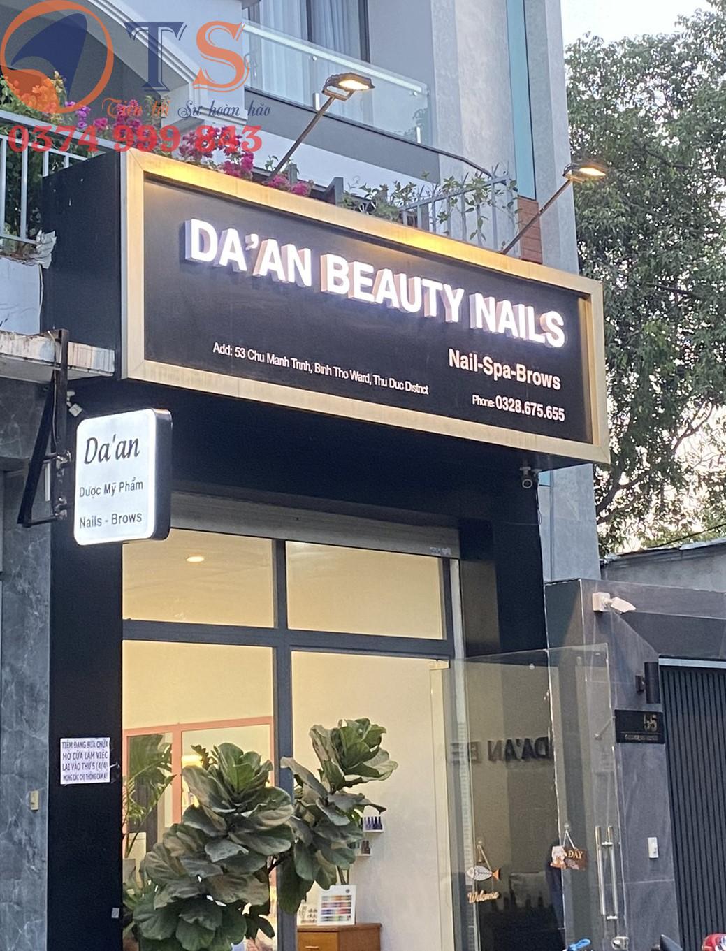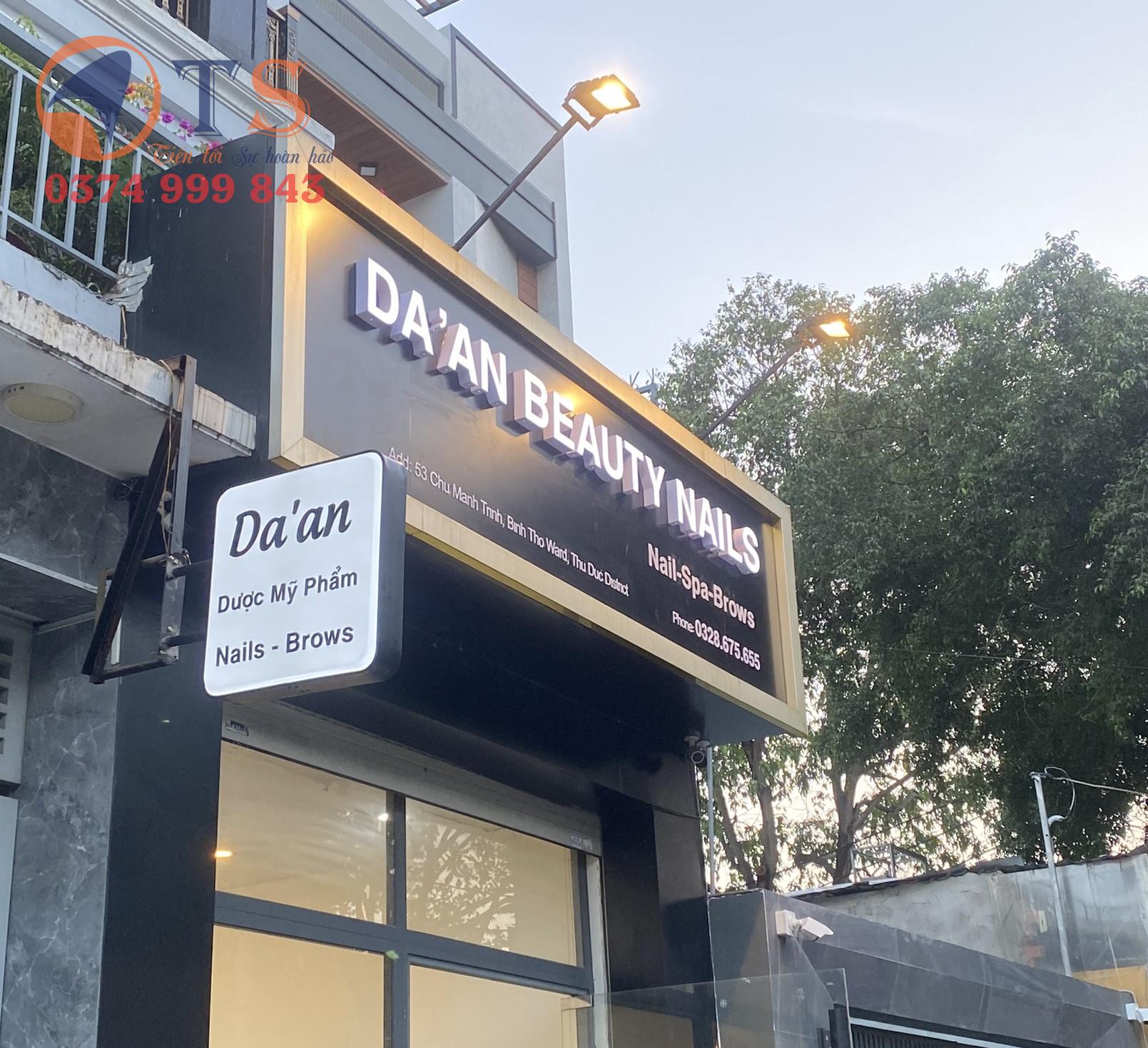 👉 Quảng Cáo TS xin giới thiệu một công trình bảng hiệu mặt dựng Alu kết hợp chữ mica sáng đèn LED, được chúng tôi thiết kế và thi công cho Da’an Beauty Nails tại Thủ Đức – TP.HCM.